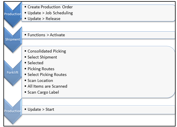 Please find below the process flow from Production order to picking of goods using forklift. This is explained in below section: