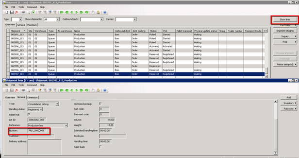 Locate the production reference by looking into the General Tab of the Shipment Lines as shown below: