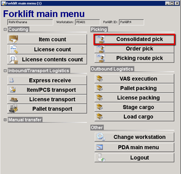 Forklift Main Menu – Select Consolidated Picking