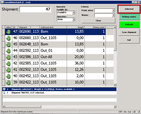 Select all the shipments until ready to start picking up of the goods.