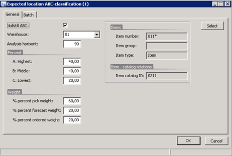 The algorithm is very close to the std. ABC classification found on items, but here all items/sizes/configs will be classified as A, B or C, based on real and expected issues an item will have. I have also included a weighting of the items issues, so you could say that real picks should weight 60%, while forecast and ordered should weight 20% each. Then new items will get a proper A-B-C classification without that it has been in sale. The ABC value of item+dimensions is just a way of making things a bit easier for the users. Behind there exists a full transactional system, that evaluated many parameters, and also lets you correctly get the right ABC classification of new items without recalculating all items each time.