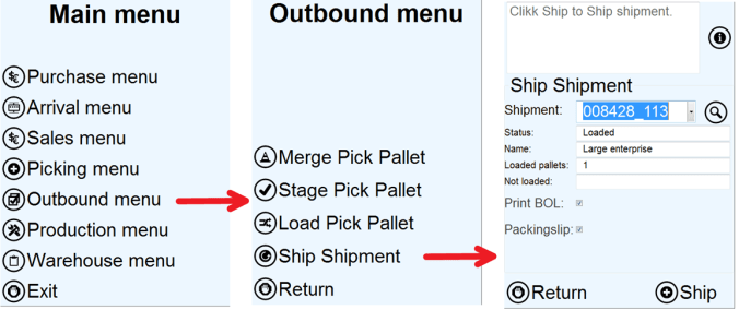 When the operator scans the shipment ID, the user will see the shipment status, name, and number of staged and loaded pallets. In addition we wanted the ability to very easily print the bill of lading and the packing slip when the shipment is sent. So that the operator just could fetch the paper documents from a nearby printer. I decided that using the print management setup would be great, and I could use the same printer as setup for packingslips