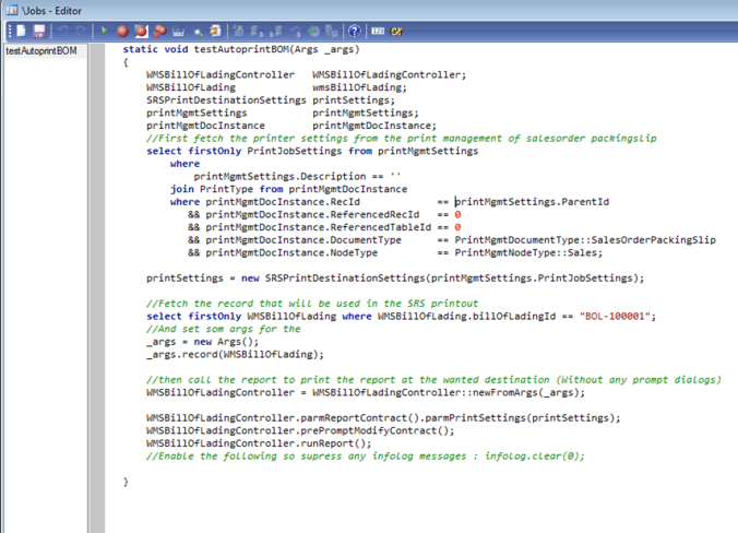 So I needed to find a way to print out these documents without any printer dialog. Through MSDN I found all I needed, but I wanted to share this with you. I have created a small job in X++ that illustrates the code I used to automatically print out the bill of lading: