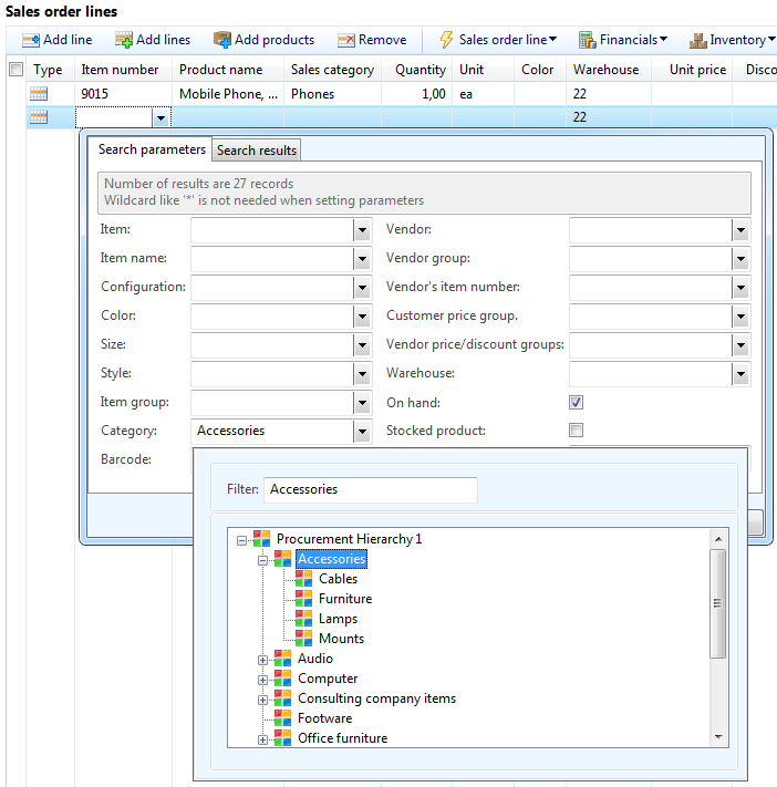 In the lookup form the user can fill inn filter criteria, like item name, colors, barcode, vendors/groups etc. I can even use the product categories like this :
