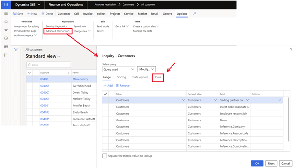 The advanced filter and query in Dynamics 3656 are a very powerful tool. Here you can search and filter on most fields and add join relations to the query.