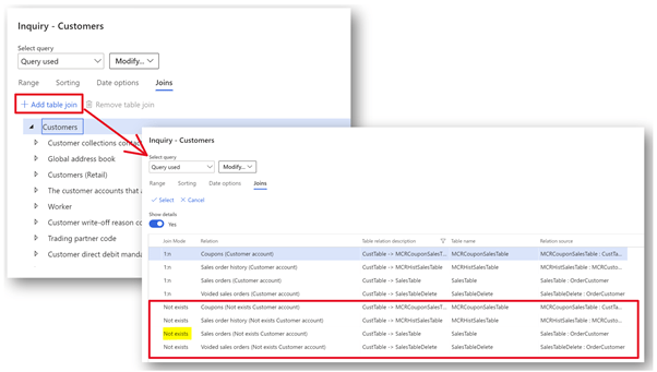 In this sample the customers will no sales orders will be in the query result/form. But the feature are generic, and all 1:n relations can also be selected as a “Not exists” relation.
