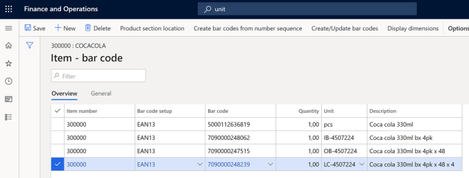 So far so good. We can model this in Dynamics 365 by having a product defined as a “Basis”, and use the inner box, outer box and pallet as unit conversions. In D365 we also have the possibility to create barcodes for each unit of measurement (UOM). It would also be quick to assume that the EPD number is an external item description.