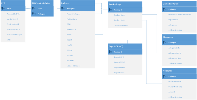 First, lets try to model how the EPD(Only subset) from a grocery supply perspective(Not D365!). An EPD can consist of multiple packaging structures, and a package main contain packages. At the bottom of the packing structure there is a reference to a basic package, that describes the product.
