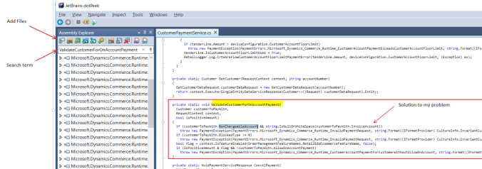 This tool let you decompile all components, and have an advanced search capability. Just all the K:\RetailServer\WebRoot\bin\Microsoft.Dynamics * files, and then search for the term ValidateCustomerForOnAccountPayment: