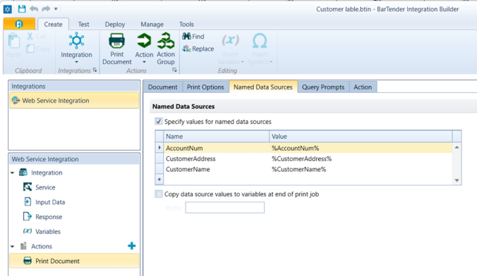 The BarTender integration builder is a fantastic tool, that makes building a REST-based integration service easy to build. Just import the already created label design, and create a variable for each named data source as demonstrated in the following video. Here you see that I have created a variable for each named data source.