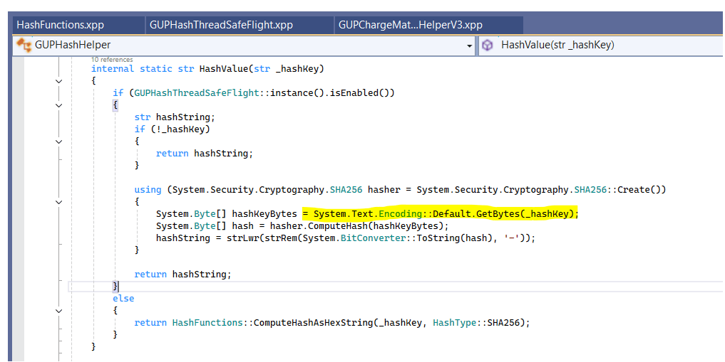 The issue with System.Text.Encoding::Default.GetBytes(_hashKey) is that