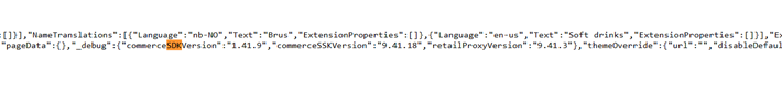 To explain the idea, when the POS and eCommerce is communicating with CSU(Commerce Scale Unit), then JSON is used as the lightweight data-interchange format. It is easy for us humans to read and it is easy for machines to parse and generate. Let’s take a concrete example. When looking up a product, then the attributes of that product is shown, and in the following example I only have one attribute; Item number, but the JSON still contains the complete structure. Sending null and default values is just taking space without transferring any actual information.