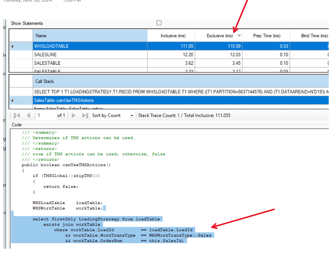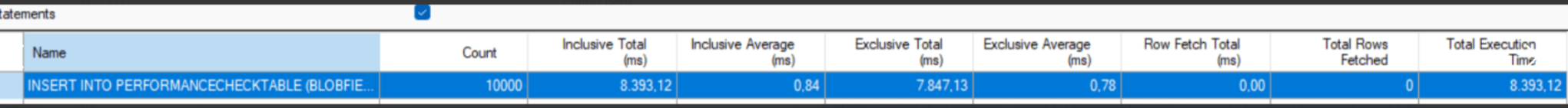 You can also see the performance test in trace parser, and here is how it looks when doing 10.000 inserts in a OK performing PROD environment. exclusive average and 0.78ms/insert is quite ok.