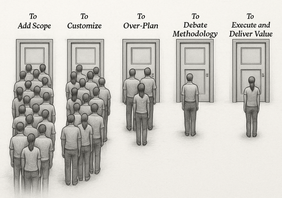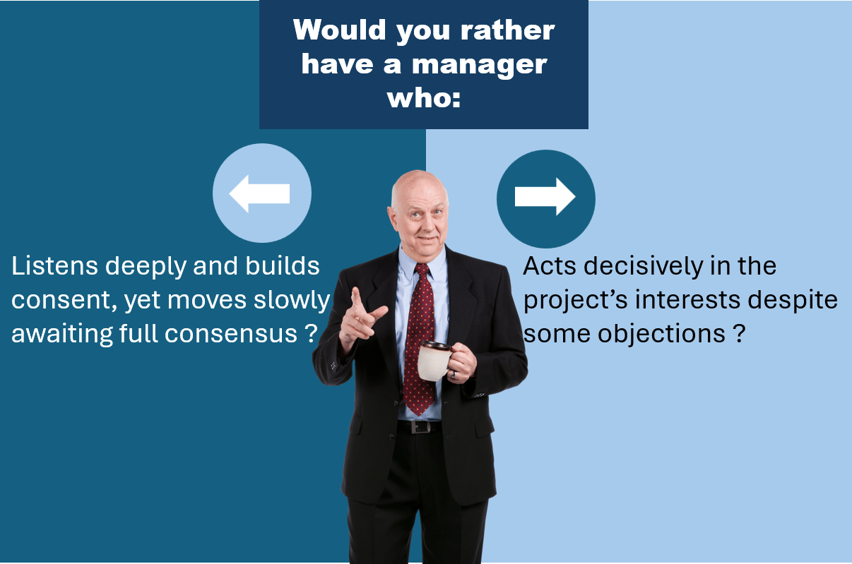 In many projects, we lose momentum not because people resist change — but because we wait too long for consensus. We keep discussing until everyone agrees. And then time flies by, costs accelerate and we fail on success criteria’s. Chasing the perfect decision means often results in winning the fight, but loosing the war. Project resources are not endless and most often have constrains we commercially must respect.