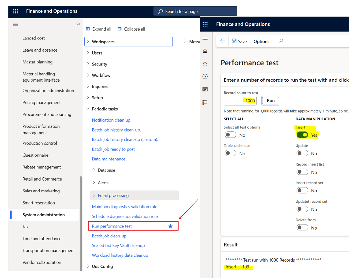 Did you know there is a very easy way to check if your core D365 database are performing OK. Use the tool ‘Run performance test‘.