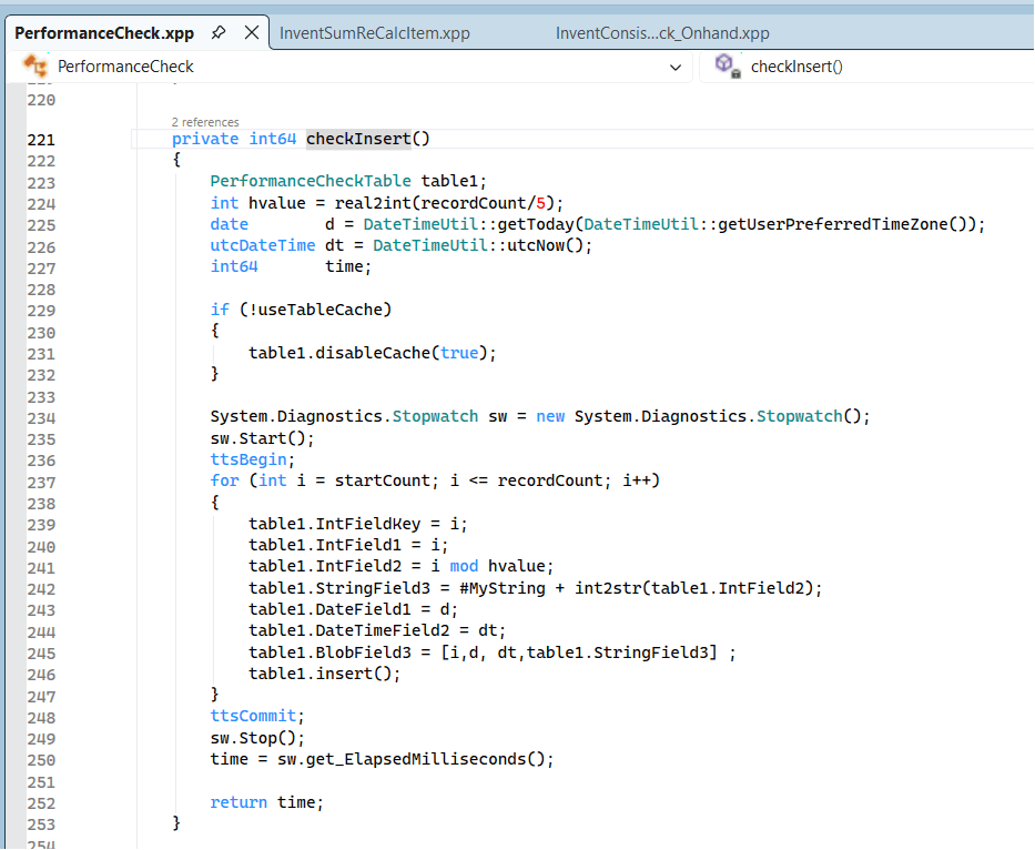 The code executed is basically just a loop inserting some fields in a table named PerformenceCheckTable.
