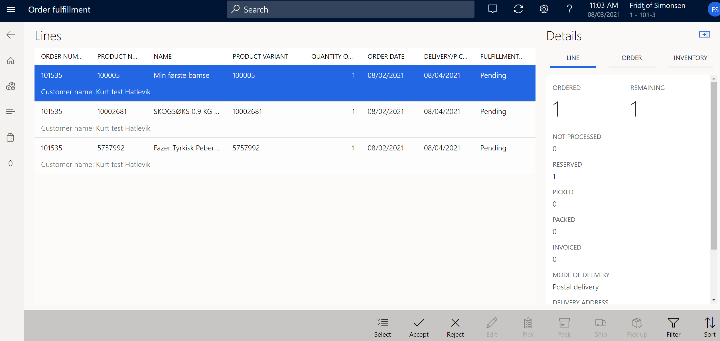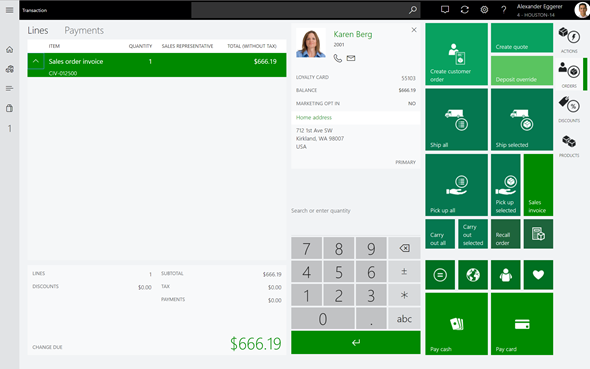 To pay the order, select the Karen customer, and use the Sales Invoice button.