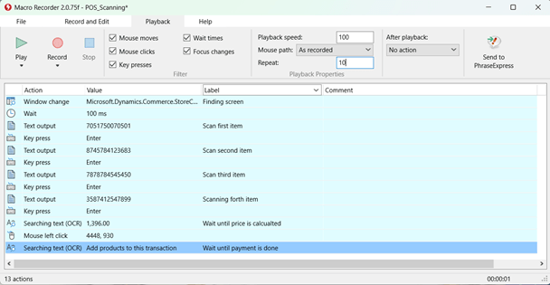 The test I will be conducting is a very small one, where I scan 4 barcodes, and then do a quick sale. I will be using the Macro Recorder, and running the script 10 times in online and in offline.