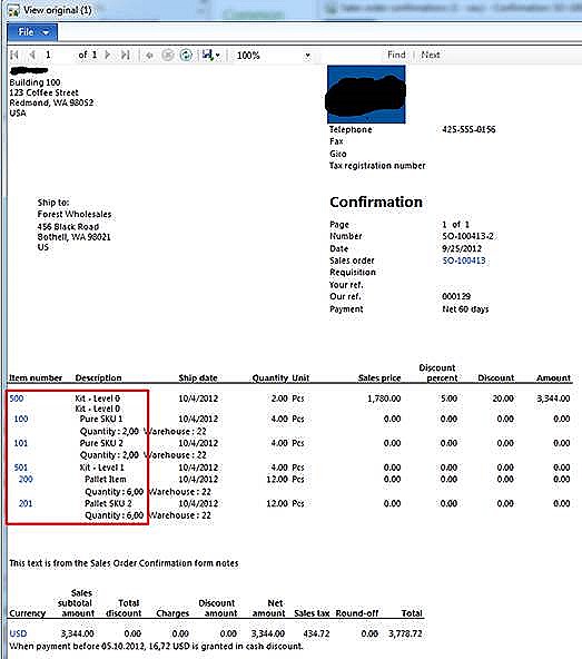 If the Show kitting structure is enabled, the form letter will show the kitting structure as follows:
