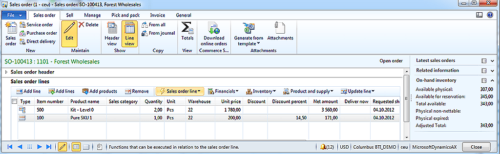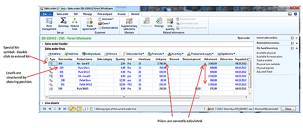 The parameter field Phantom that exists on the item table. This parameter defines if a BOM item is exploded on the sales line. Explosion of BOM item is performed on all BOM levels and all the phantom BOM levels create sales lines marked as a kit, while real items create normal sales lines. The relation between levels for the Kit sales lines is established via a new reference field related to the sales line. When using the sales order screen, the order looks just like the normal sales order screen: