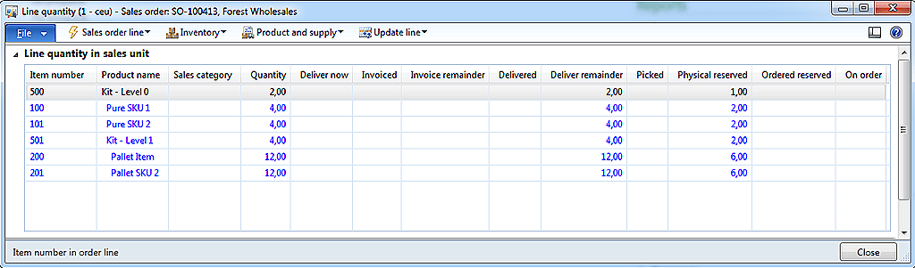 The final kits do not have inventory transactions. The reason for this is that kits are “virtual items” that do not need a physical picking. It is the sub-components that are picked. Kits are still being packing slip updated and printed on the invoice. But still it is possible to see the order process flow of kits, since this can be calculated on the basis of the kit lines. The line quantity form will therefore still give meaning as shown here.