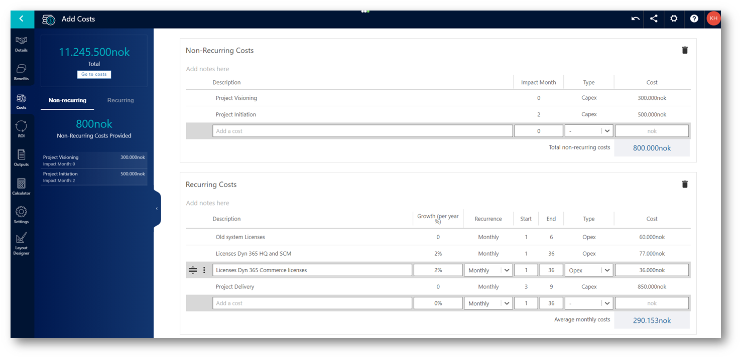 The cost picture of the business case can often be presented based on non-recurring costs and recurring costs per month.